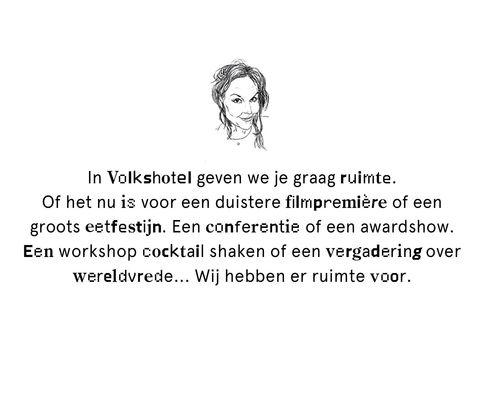 In Volkshotel geven we je graag ruimte. Of het nu is voor een duistere filmpremière of een groots eetfestijn. Een conferentie of een awardshow. Een workshop cocktail shaken of een vergadering over wereldvrede… Wij hebben er ruimte voor.